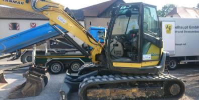 Der richtige Bagger für enge Baustellen/Gärten sowie in Gebäuden. Kontergewicht und Motorhaube sind so konstruiert, dass das Heck beim Drehen der Maschine nur minimal über die Ketten hinaus ragt. Bequemes wechseln von Löffeln/Anbaugeräten per Knopfdruck aus der Kabine. Der Powertilt ermöglicht sämtliche Anbaugeräte bis zu 90° Schwenkwinkel beidseitig (180°) zu bewegen.