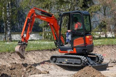 Der richtige Bagger für enge Baustellen/Gärten sowie in Gebäuden. Kontergewicht und Motorhaube sind so konstruiert, dass das Heck beim Drehen der Maschine nur minimal über die Ketten hinaus ragt. Bequemes wechseln von Löffeln/Anbaugeräten per Knopfdruck aus der Kabine. Der Powertilt ermöglicht sämtliche Anbaugeräte bis zu 90° Schwenkwinkel beidseitig (180°) zu bewegen.
